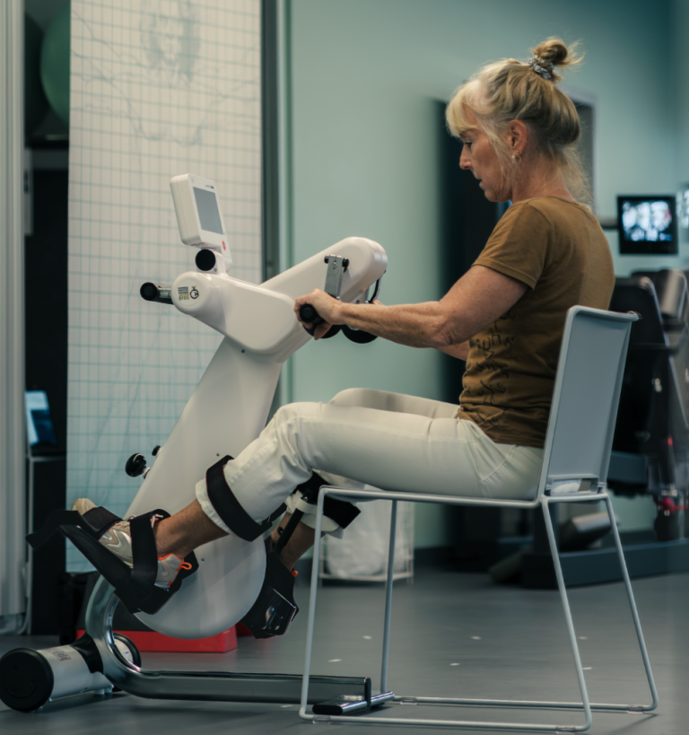 Die MOTOmed Bewegungstherapie wurde für Menschen mit Bewegungseinschränkungen entwickelt und ergänzt Physio-, Ergo- und Sporttherapeutische Maßnahmen. NutzerInnen können sitzend im Rollstuhl oder vom Stuhl aus trainieren.